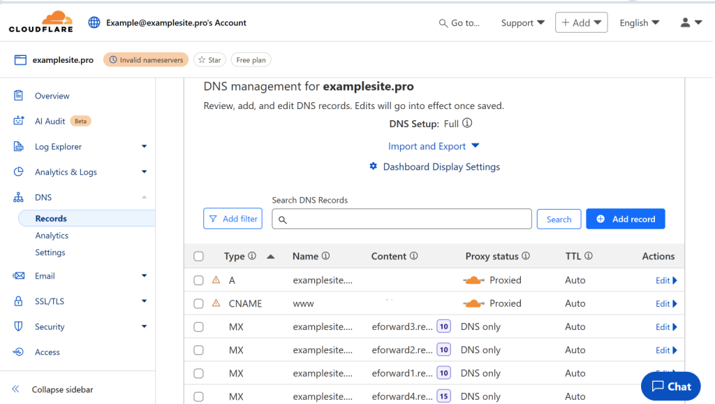 With this, you want to make sure the orange cloud stays orange, and it says proxied. This means traffic to your site, will traverse through the Cloudflare network. A grey cloud will expose your record, while an orange cloud hides it.